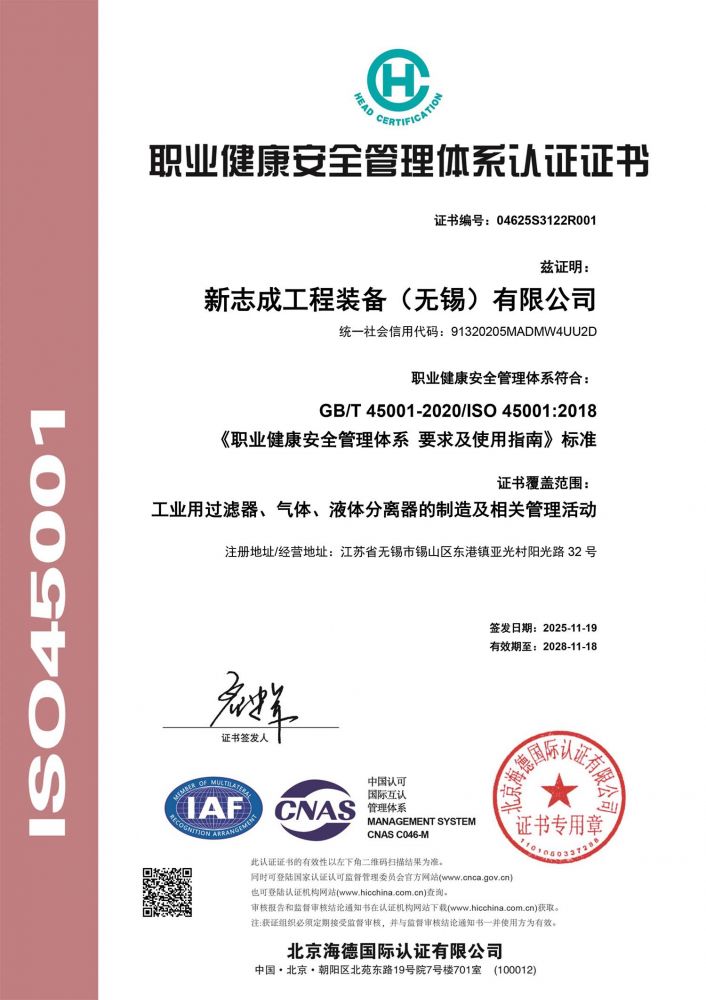 职业健康安全管理体系认证证书